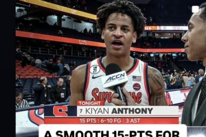 体育资讯11月5日讯 在昨天的一场NCAA比赛中,雪城大学85-47大胜宾汉顿大学。卡梅隆·安东尼之子基扬·安东尼完成了大学正式比赛的首秀。